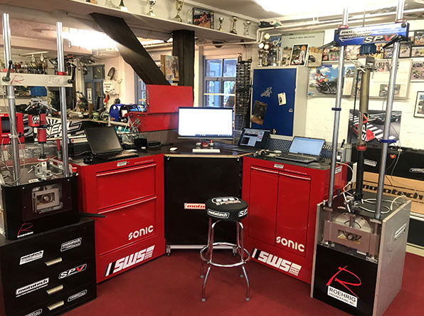 Wir verwenden dazu 3 verschiedene Prüfstände. Dämpfergeschwindigkeiten stufenlos 0,03 bis 35,00 m/sec, Dämpferkräfte bis zu 26.500 Newton messbar, Dämpfer und Gabellängen aller Hersteller messbar, kontaktfreie Infrarot-Temperaturmessung, Roehrig Shock 6.5.0 Software, Mathlab.